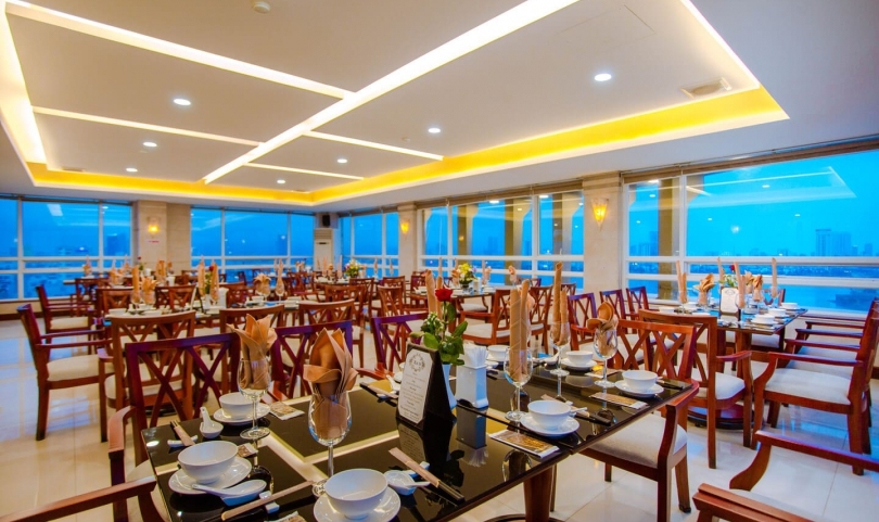 The restaurant is located on the 12th floor of the hotel, luxurious design and service, panoramic view of Da Nang center and Han river, server buffet, lunch, party,... with a capacity of up to 120 customers.